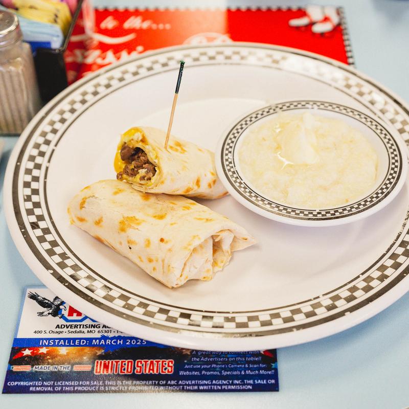 Two eggs with cheese, ham, bacon, onions & green peppers wrapped in a warm tortilla and served with our homemade home fries or grits