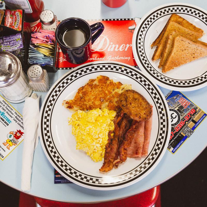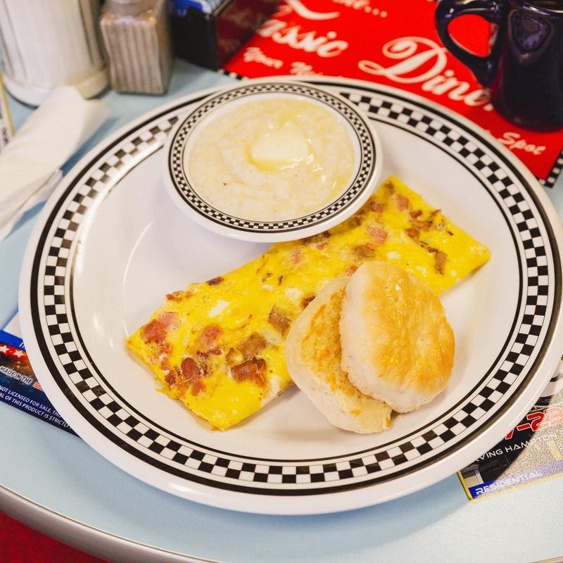 Jumbo slices of Texas toast served with two eggs any style, and your choice of bacon, sausage or ham