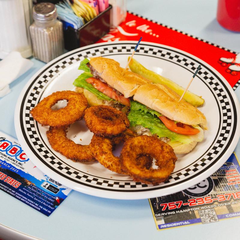 Mouthwatering mounds of chopped steak, grilled, sauteed onions, green peppers, mushrooms, & mayo with melted provolone cheese served on a hoagie roll