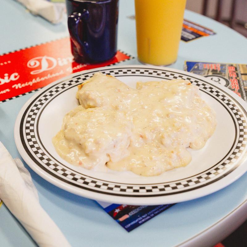 2 buttered & grilled buttermilk biscuits smothered in our homemade sausage gravy with home fries or grits | Half-order $8.00 • Add two eggs on top +$2.00