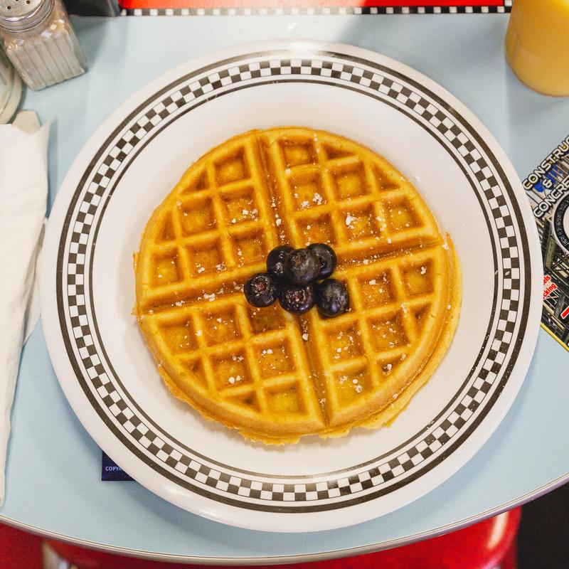 A crisp golden Belgian waffle served with two eggs any style, and your choice of bacon, sausage or ham