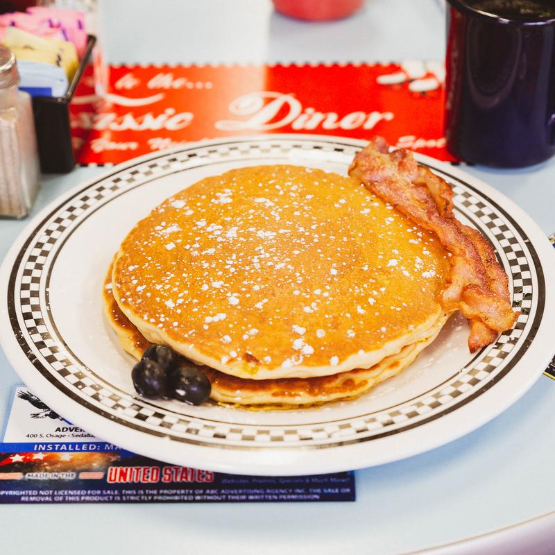 Two buttermilk pancakes served with two eggs any style, and your choice of bacon, sausage or ham