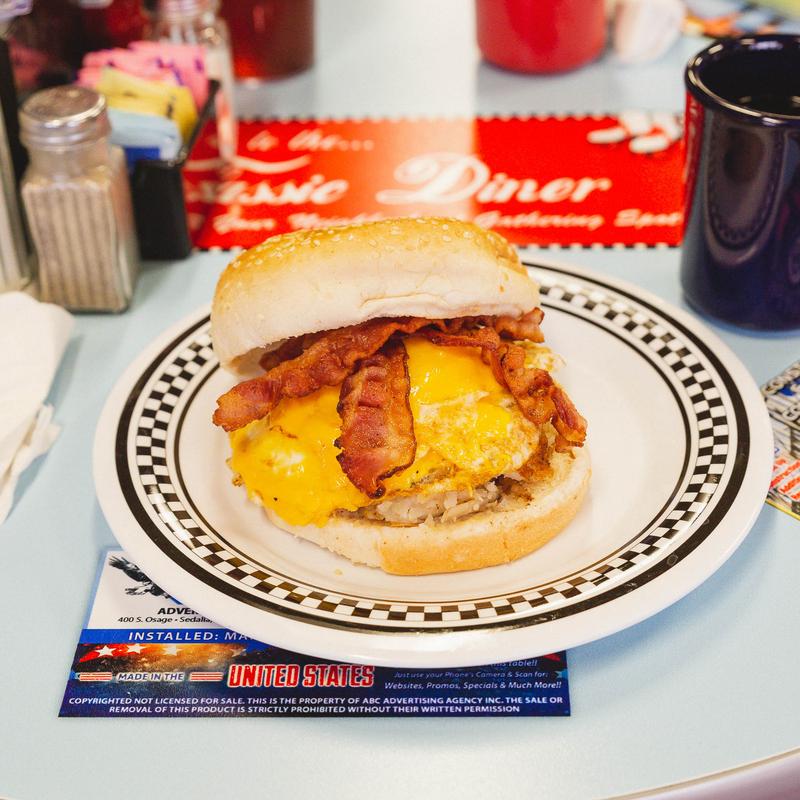 Two fried eggs topped with bacon, ham or sausage & cheese served on your choice of bread (white, wheat, rye, sourdough, cinnamon raisin, English muffin, bagel, biscuit or roll)